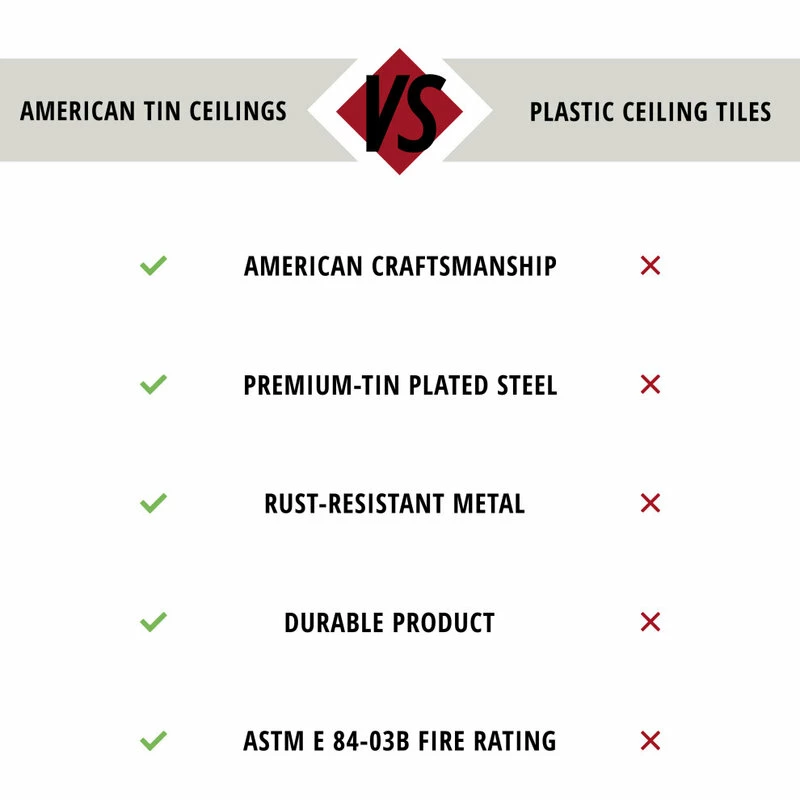 Set of 5 panels. Make your ceiling or accent wall memorable with pattern #2. This (2 ft. x 2 ft.) authentic tin tile has a 12 inch pattern with arching diamonds that produces tiling floral coin. Its versatile design lends itself to being one of the most popular designs in the industry for it’s distinct Victorian feel. Easy installation for a DIY project.