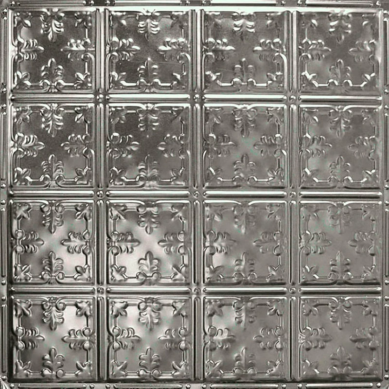 Set of 5 panels. Drawing inspiration from the Barbary Coast of Northwest Africa, meet pattern #21. This (2 ft. x 2 ft.) authentic tin tile has a distinct Ottoman flair. Its 6 inch pattern with opulent repeating embossments of the iconic Fleur-de-lis, makes it ideal for accent spaces. Easy installation for a DIY project.