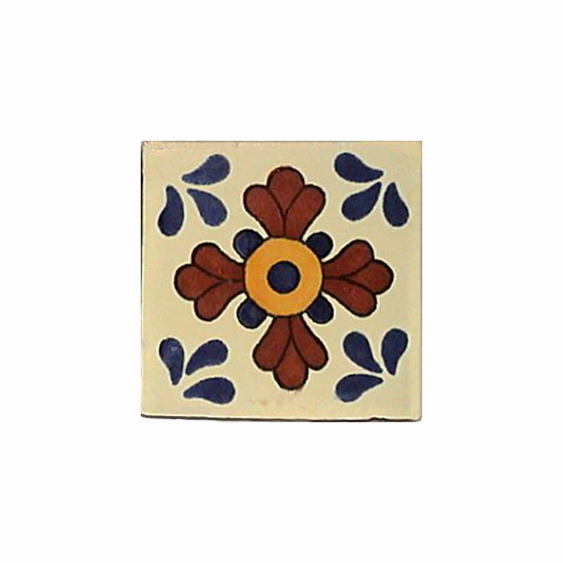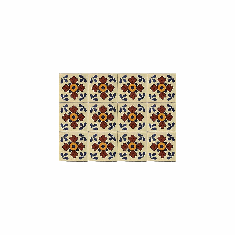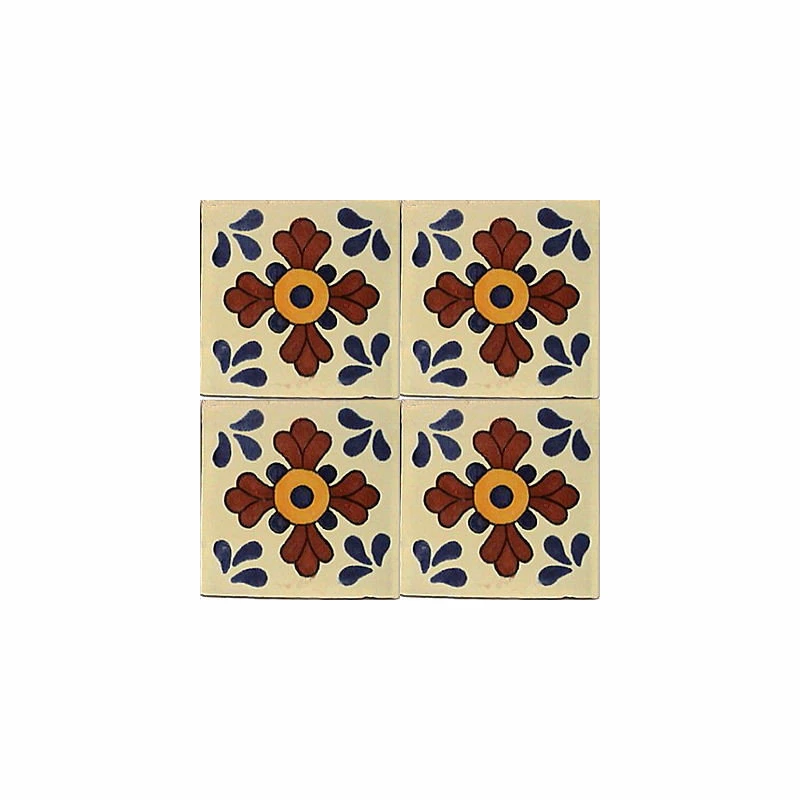 The pattern found in this ceramic tile comprises a set of terracotta flowers with yellow round centers. When four or more tiles are put together, a blue flower emerges at the center of each corner intersection(as shown in the second picture). The third picture shows the pattern created by this tile in a 4×4 arrangement. Each piece of Mexican Talavera tile is hand painted, offering you a one of a kind product. No two tiles are exactly the same, and will vary slightly in color and shape. These changes might also happen from shipment to shipment, so it is important to order the whole set of tiles for your project at the same time.