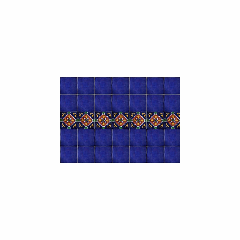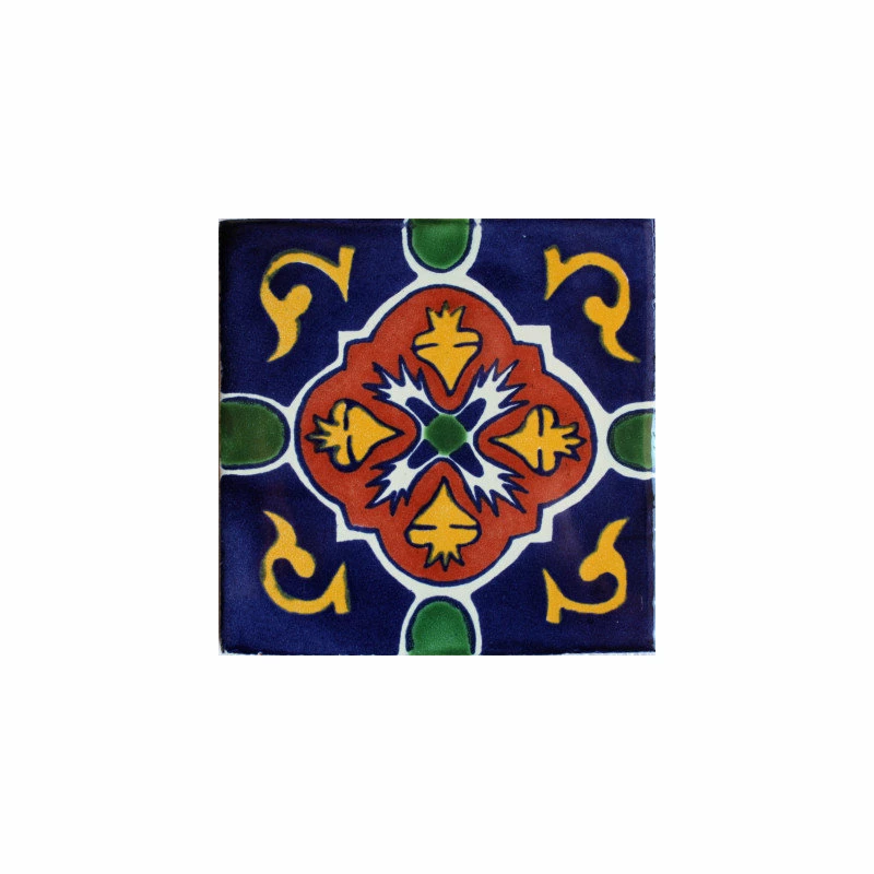 This Talavera clay tile is hand-painted in a mostly dark blue background with orange, white, green, and brown motifs. As a matter of fact in the manufacturing process, the whole tile is painted in white as a first step and then in a second step, the rest of the tile is painted on top of the white one. The adjacent pictures show some patterns you can make using more than one tile, first is a combination of the Greca C Talavera Ceramic Tile and the last one shows the Blue Grenada Talavera Ceramic Tile along the Church Dome Talavera Ceramic Tile. .When you put more than one tile by the other, it shows beautiful patterns created when one complements each other.This tile is hand-painted, this means that no two tiles are exactly alike! There might be small differences in size, weight and even the colors.This tile is special for small patches or entire wall decoration, as you can see from the patterns found in the last two pictures.