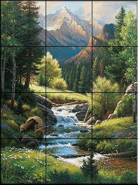 A bear tile mural makes a great addition to your kitchen backsplash tile project or bathroom tiling project. Bear and woodland scene tiles for your kitchen backsplash or bathroom shower tile. Unique artwork on tiles of bears and nature scenes for tiles. Decorative bear picture tiles. We have pictures of polar bears for tiles, grizzly bears on tiles, black bear decorative tiles and bear cub decorative tiles.