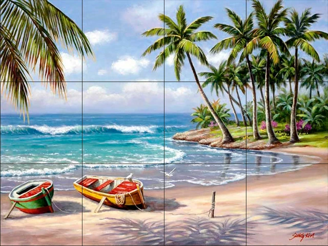 Our beach scene tile murals are great for your kitchen backsplash wall tile project. Beach tiles are also commonly used in bathroom tile projects. Beach scene tiles include tiles with beach scenes, ocean theme tiles, wave tile murals, tile murals of beach chairs and sunset tile mural scenes.
